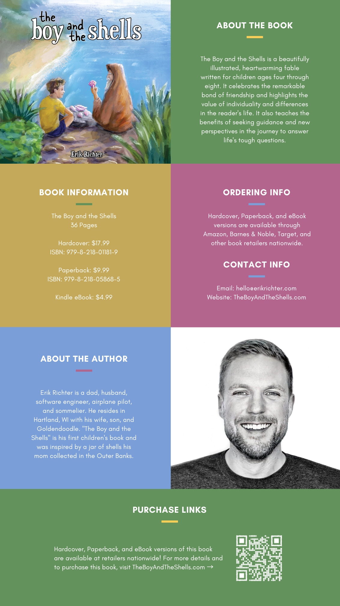 Hardcover, Paperback, and eBook versions of "The Boy and the Shells" are available through Amazon, Aerio, Barnes & Noble, Target, and other book retailers nationwide.